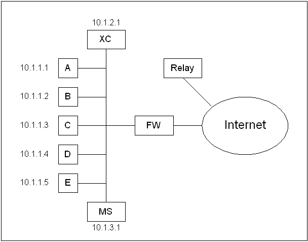 Nella figura sottostante è mostrata la struttura che verrà impiegata negli esempi che seguono. La rete è costituita da un firewall che implementa il Network Address Translation (NAT) e gestisce il traffico in entrata e in uscita. La rete interna ha classe di indirizzamento 10.1.0.0/16 e la struttura è dotata di un server mail interno, nonchè di un server di relay esterno che viene impiegato per spedire la posta.