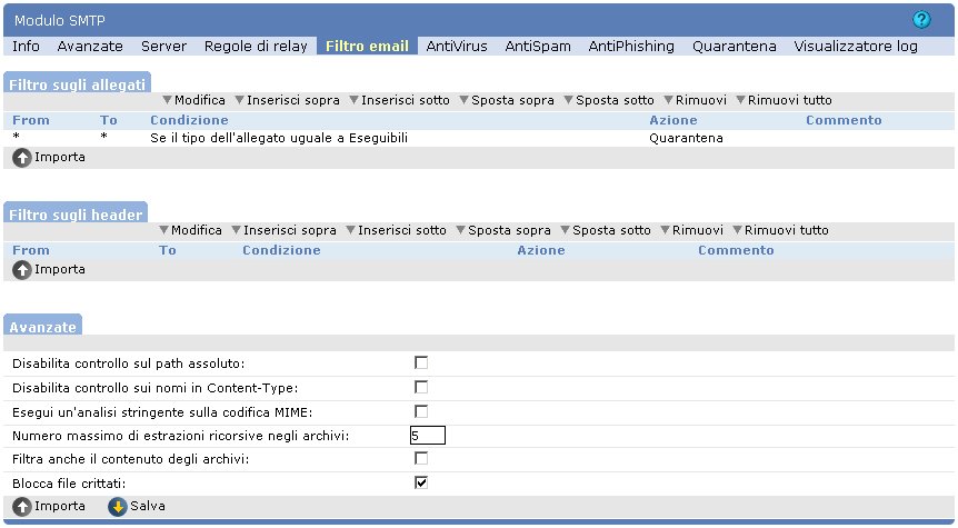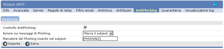 Selezionare "Controllo AntiPhishing". Il form relativo al marcatore permette di definire il tag da inserire all'interno dei subject delle mail di phishing. Nel "Modulo SMTP" è possibile scegliere di mettere in quarantena o eliminare il messaggio oltre che a taggare il soggetto.