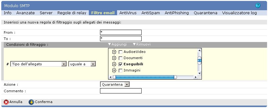 Dalla schermata di configurazione della regola di filtraggio premere su "Aggiungi" e poi nella nuova riga che apparirà scegliere "Tipo dell'allegato". Nel frame selezionare "Eseguibili" e poi premere su "Conferma" lasciando ogni altro campo al valore di default.