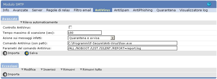 Selezionare "Controllo AntiVirus" se è installato un antivirus supportato il path di installazione verrà rilevato automaticamente e saranno anche impostati i parametri di scansioni di default. Utilizzando un antivirus non supportato sarà necessario inserire manualmente il percorso in cui il programma ` installato e i parametri necessari al corretto funzionamento. Nel "Modulo SMTP" è possibile scegliere l'azione da intraprendere in caso di messaggio virato.