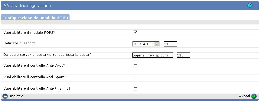 Indicare in "Indirizzo di ascolto" l'indirizzo IP e la porta su cui si porrà in ascolto il modulo. Si consiglia di mantenere i valori di default a meno che la coppia IP-porta non sia già in uso. Nella voce "Da quale server di posta verrà scaricata la posta?" indicare il mail server da contattare per il download, che nel caso specifico sarà quello del provider che fornisce il servizio di posta elettronica. Nelle ultime righe sono riportati tre checkbox per l'attivazione del controllo Anti-Virus, Anti-Spam ed Anti-Phishing. Poi premere su "Avanti".