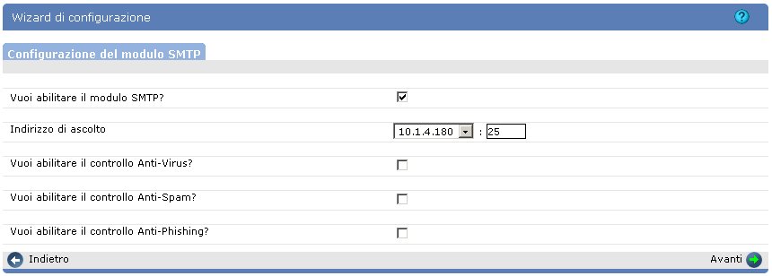 Indicare in "Indirizzo di ascolto" l'indirizzo IP e la porta su cui si porrà in ascolto il modulo. Si consiglia di mantenere i valori di default a meno che la coppia IP-porta non sia già in uso. Nelle ultime righe sono riportati tre checkbox per l'attivazione del controllo Anti-Virus, Anti-Spam ed Anti-Phishing. Poi premere su "Avanti".