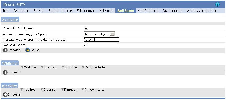 Selezionare "Controllo AntiSpam". Il form relativo al marcatore permette di definire il tag da inserire all'interno dei subject delle mail di spam. Nel "Modulo SMTP" è possibile scegliere di mettere in quarantena o eliminare il messaggio oltre che a taggare il soggetto.
