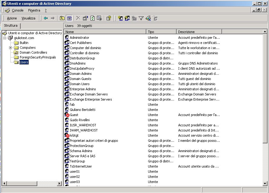 Active Directory è un database integrato nei server Windows 2000 e Windows 2003 che fungono da domain controller e consente di catalogare e gestire in modo centralizzato risorse di vario genere come: utenti, gruppi di lavoro, stampanti, cartelle condivise, ecc. La struttura del database è di tipo gerarchico, con contenitori che contengono oggetti e altri contenitori.